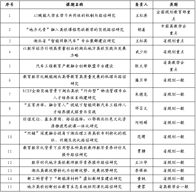 本网讯(文/肖玲莉)近日,全国教育科学规划领导小组办公室、中国高等教育学会、湖北省教育科学规划领导小组及省高教学会相继公布下达了2023年度立项课题名单,英国上市公司365共有15项课题获批立项,其中,重点课题5项、一般课题10项,全国规划教育部重点项目实现零的突破。