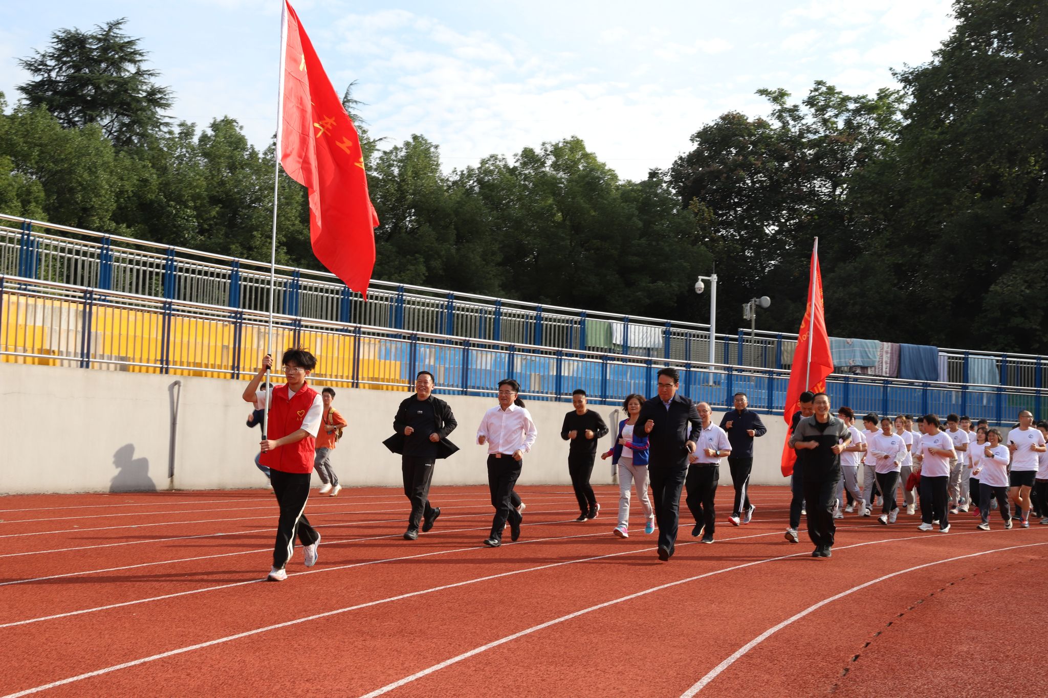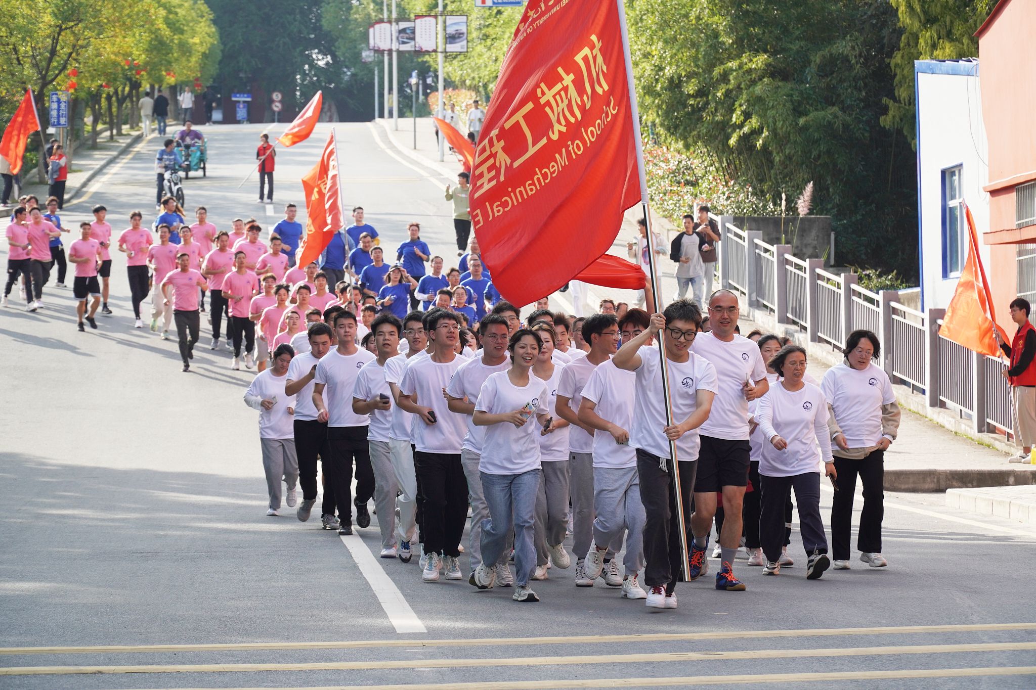 蓝天高悬,云朵悠然。迈着轻盈的步伐,迎着舒适的秋风,伴着欢快的口号,各代表队陆续抵达环校跑的终点扩建校区北大门,并在此合影打卡留念。