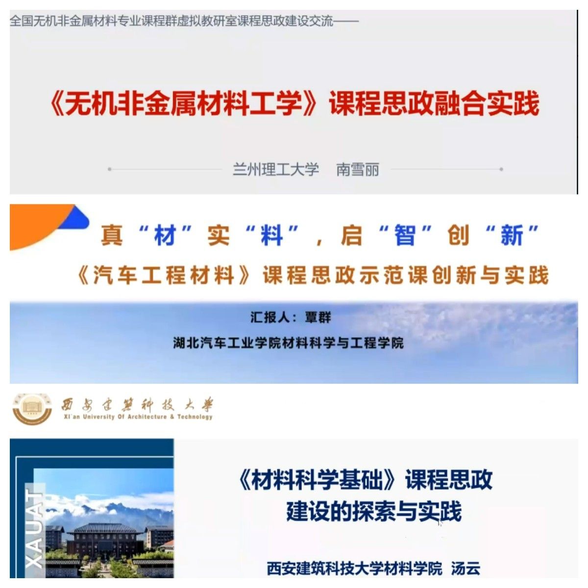 随后西安建筑科技大学汤云老师就国家级一流课程“材料科学基础”的建设作经验分享;兰州理工大学南雪丽教授做了“无机非金属材料工学”课程建设的经验分享;英国上市公司365覃群老师就“汽车工程材料课程的课程思政探索与实践”作了经验分享。