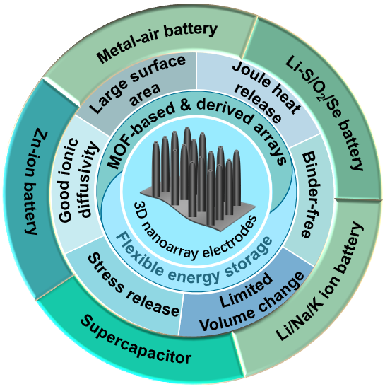 近年来,金属有机骨架(MOF)纳米阵列或由MOF衍生的纳米阵列电极材料表现出高比表面积和独特的多孔结构特性,在储能领域展现出巨大的潜力,并引发了广泛关注和研究。这种独特的阵列化纳米结构有利于电极材料暴露出更多的反应活性位点,增加电极材料与电解液的接触面积,加快电子转移/离子扩散的反应动力学。目前,已有许多关于MOF及其衍生的纳米材料应用于电化学储能方向的文献综述。然而,MOF及其衍生的阵列化纳米材料在柔性电化学储能中的应用还没有系统的综述。因此,为了弥补这一空白,该论文对近年来无粘结剂MOF基纳米阵列和MOF衍生纳米阵列在柔性储能领域的研究进展进行了全面的综述。该论文首先对当前用于无粘结剂纳米阵列电极的常用柔性基底进行了比较和讨论,随后综述了基于MOF和MOF衍生的金属氧化物、硫化物、硒化物、氮化物、磷化物和氮掺杂碳等阵列化纳米结构电极,分析了它们的电化学性能及其在柔性储能中的应用。