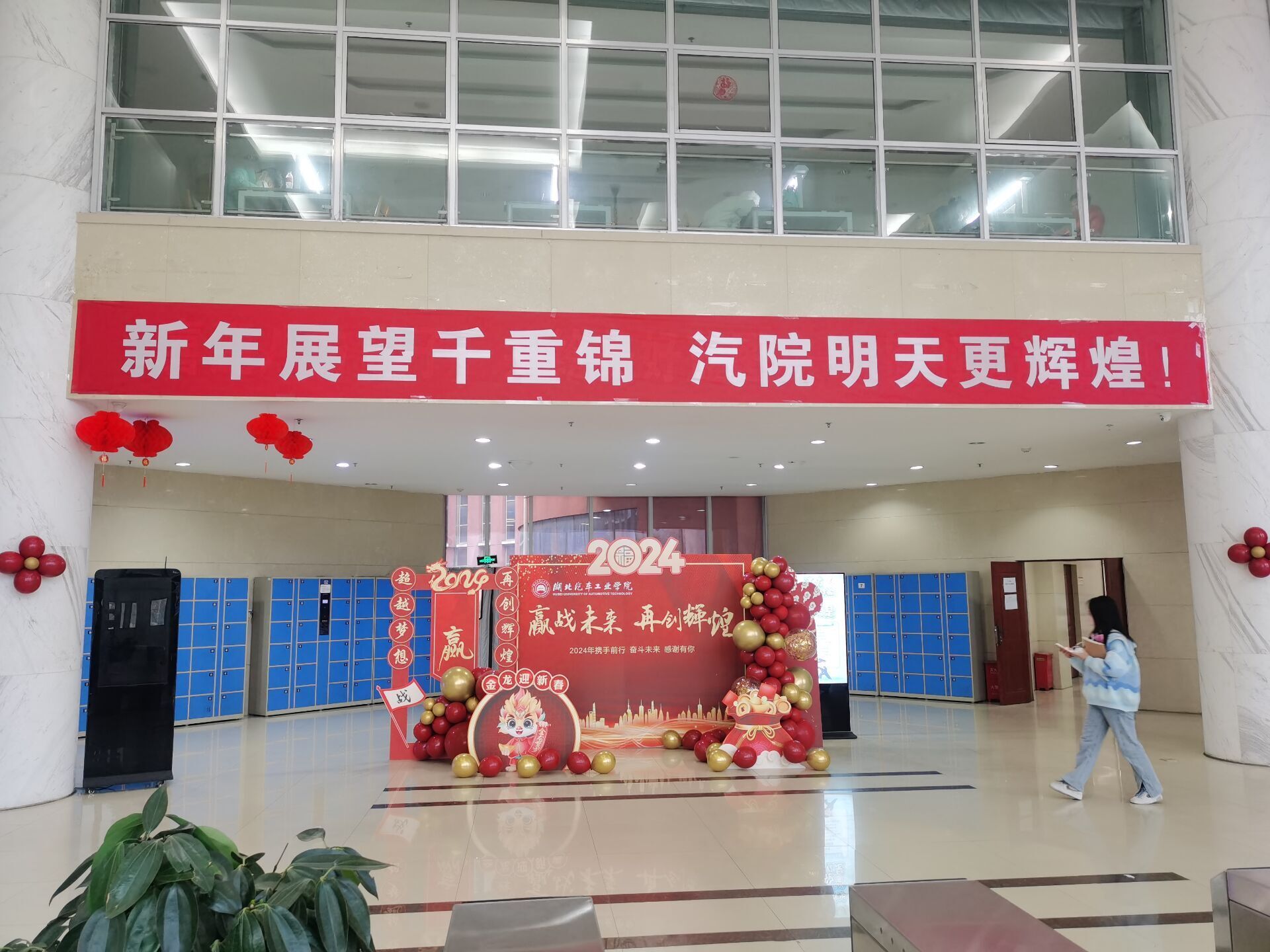 “新年展望千重锦,汽院明天更辉煌!”图书馆充分利用新年文化创意作品,在馆内营造辞旧迎新的喜庆氛围。