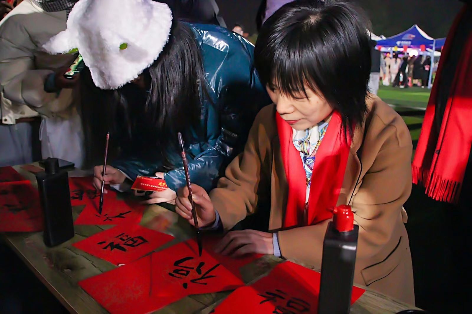 晚会结束后,田径场上的迎新年游园会如期开始。心愿集市摊位前,同学们挑选着心仪的物品;富有社团特色的游戏点位,来往的师生络绎不绝;签名墙上,写满了同学们在新年里对个人、对学校的祝福。张红霞来到书画协会的点位前,手写福字,为师生们送上美好祝愿。