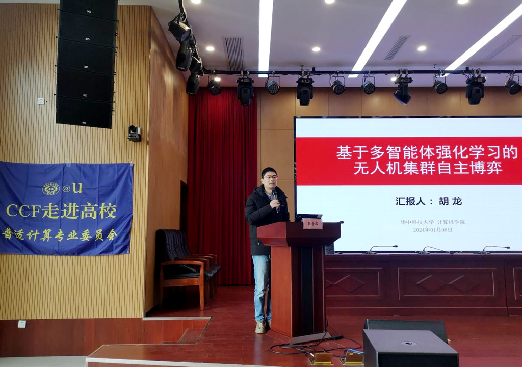 胡龙副教授作了主题为“基于异构可信策略的无人机集群跨域自主博弈”专题报告,他提出基于多智能体的强化学习对抗博弈算法,以提升无人机集群自主协同以及虚实迁移偏差下的策略鲁棒性。