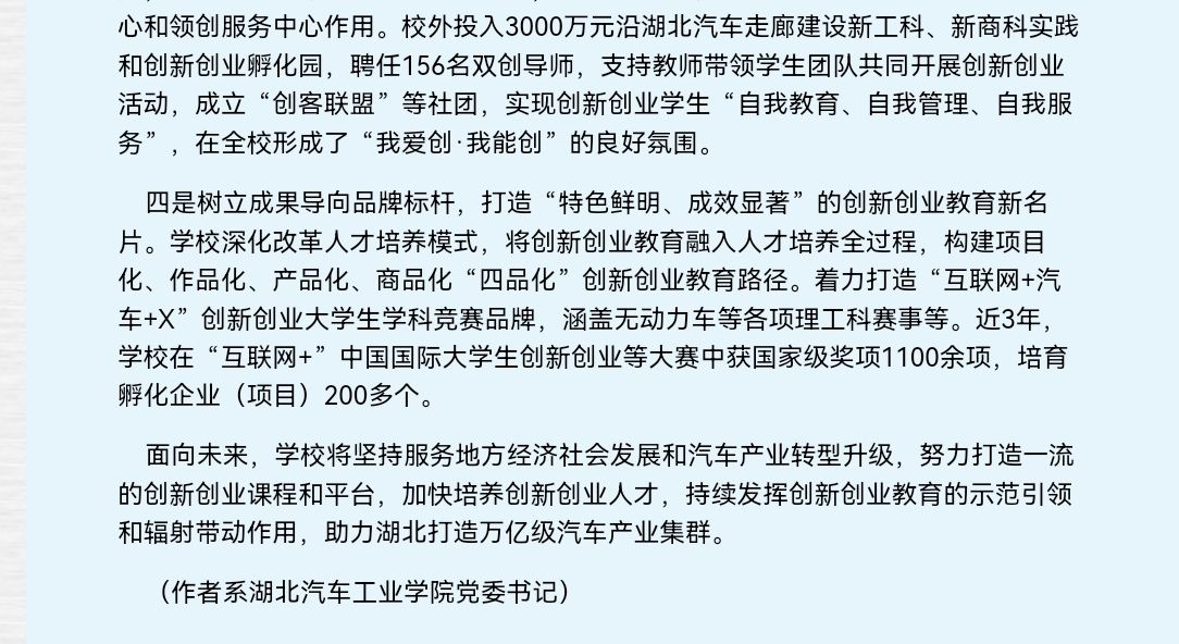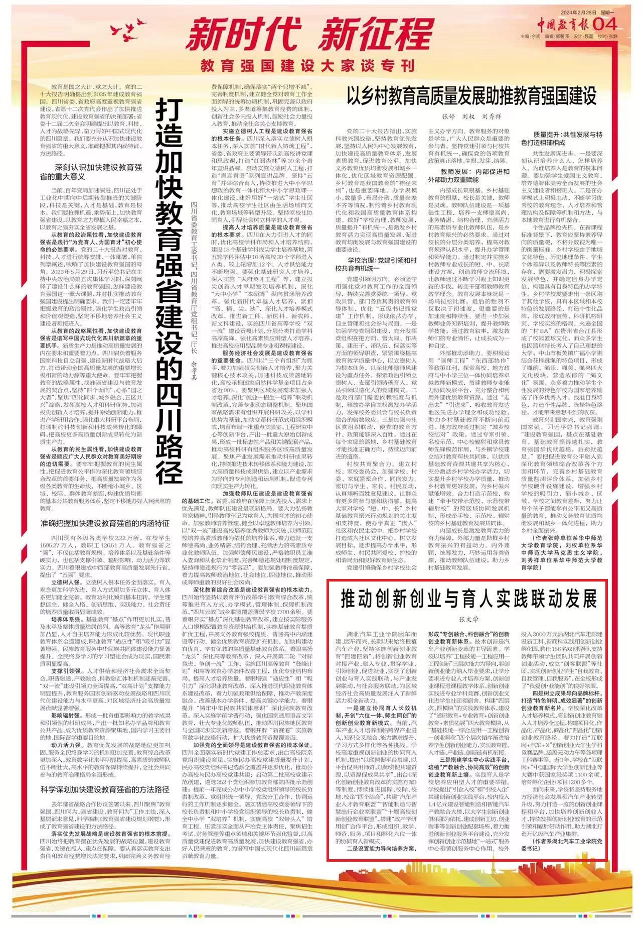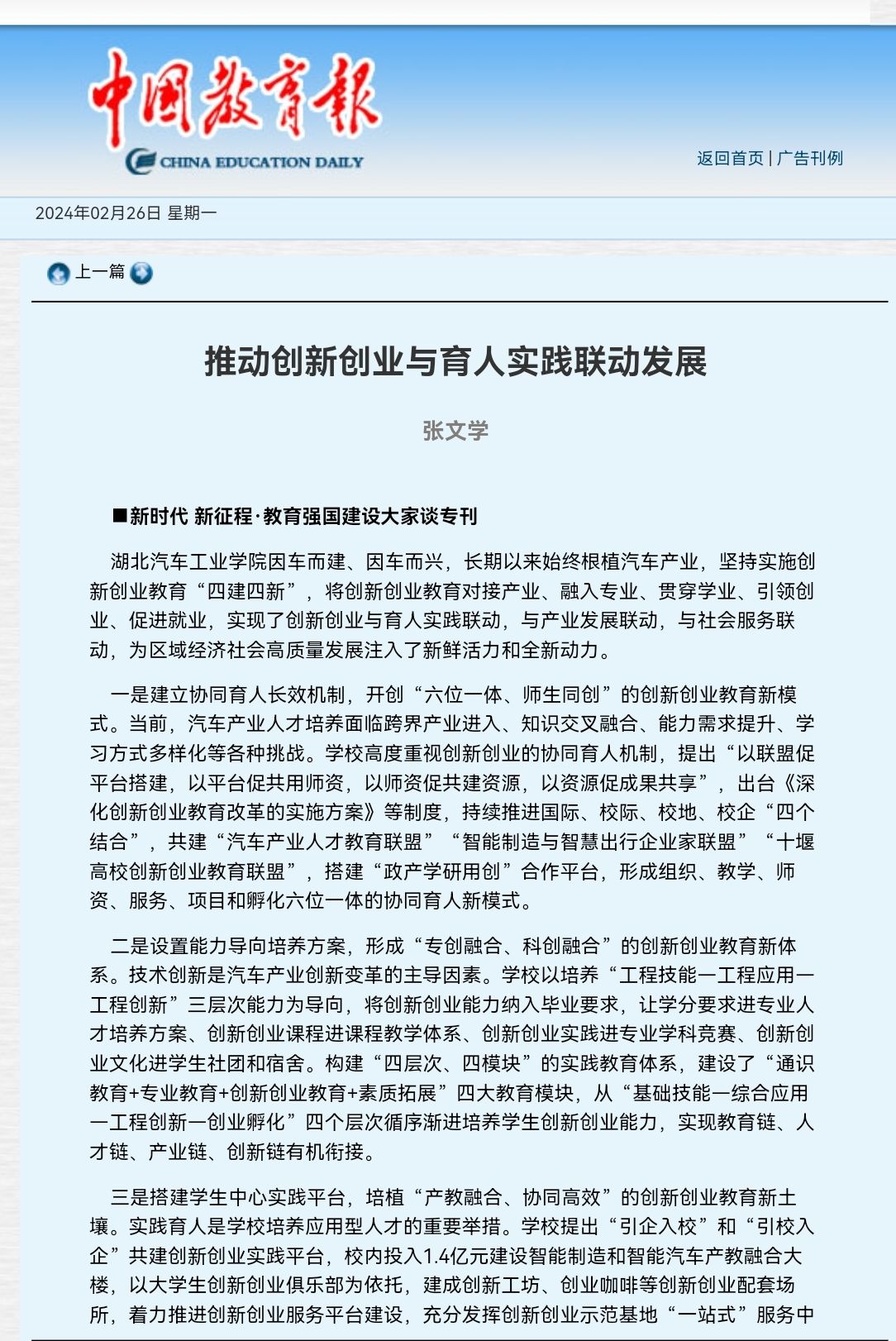 2月26日,《中国教育报》“教育强国建设大家谈专刊”刊发校党委书记张文学理论文章《推动创新创业与育人实践联动发展》,点亮了汽院龙年“开门红”,吹响了学校外宣“冲锋号”!