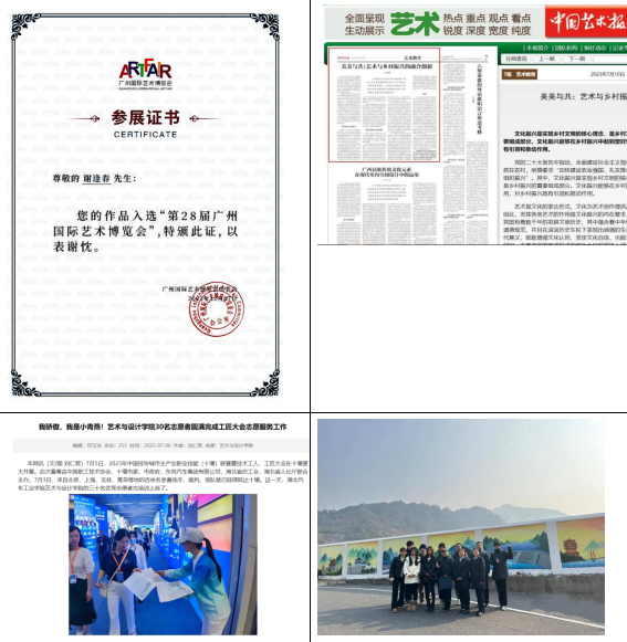 助力学校社会声誉提升,谢逢春副教授作品入选第28届广州国际艺术博览会。助力乡村振兴,程炎明副教授“百校百县”项目:“产业致富,品牌兴村——助力乡村振兴(核桃树垭村)的产业规划模式与实施”研究成果《美美与共:艺术与乡村振兴的融合创新》在《中国艺术报》上发表。助力城市发展,30名志愿者圆满完成2023中国技协城市主产业职业技能(十堰)联赛暨技术工人、工匠大会志愿服务工作。助力企业服务,与湖北交投鄂西北运营公司实施“校企共建”带来交通新体验。助力共同缔造,与周家沟社区联合开展“五亮五共暖社区、廉洁廉政牢根基”活动,社区墙绘缔造幸福生活被十堰市“五亮五共”活动典型事迹(第九期)推介展示。