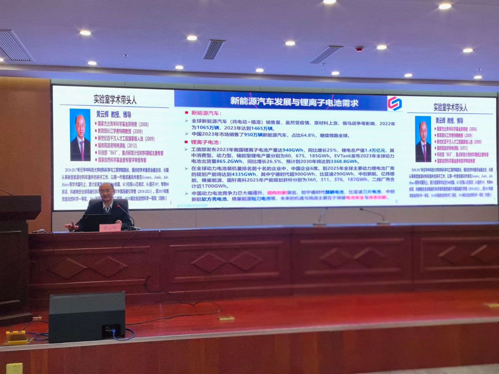 报告会上,黄云辉围绕新能源汽车发展与锂离子电池需求、新能源与储能电池发展、锂离子电池等储能电池发展趋势与挑战三个方面,从新能源汽车发展与锂离子电池需求出发,深刻分析了电池产业与汽车工业对的深度结合,全景式地描绘了锂离子电池发展的新趋势,分析了行业对人才发展的需要与影响,并结合实验室的工作与成果,详细介绍了团队里科学交叉研究、人才融合培养、科技驱动创业深度融合发展的现状,及动力与储能电池领域的技术攻关方向与未来的科学目标。
