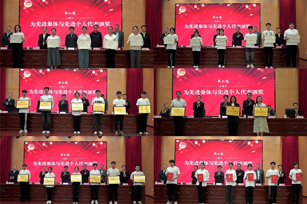与会领导分别为优秀共青团员、优秀学生干部、优秀共青团干部、优秀学生社团、优秀志愿者分会、优秀学生分会、五四红旗团支部、五四红旗团委等获奖集体和个人代表颁奖。