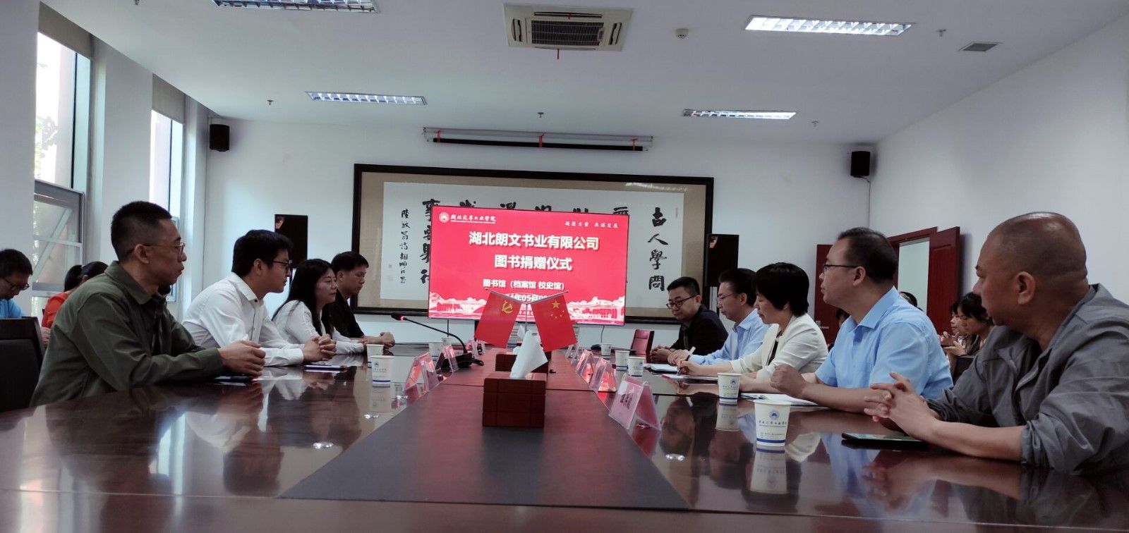 张红霞向湖北朗文书业有限公司副总经理叶望一行表示热烈的欢迎,对公司给予学校教育事业发展的慷慨捐赠表示衷心的感谢和崇高的敬意。她介绍了学校“三步走”发展战略,对学校办学规模、人才培养、学科建设、新校区建设等特色亮点进行了全面介绍。她表示,这次图书捐赠充分体现了公司履行社会责任、热心公益的责任担当,学校也将积极发挥自身优势支持公司的事业发展,希望双方合作能结出更多硕果。