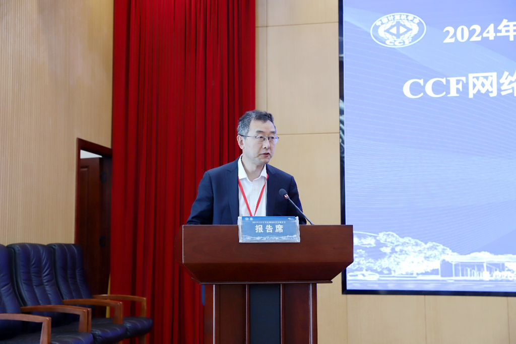 开幕式后,华中科技大学廖小飞教授做了“图计算:挑战与实践”主题报告,介绍了图计算的核心概念和技术以及如何更好地应用图计算技术解决实际问题,强调了其潜在的影响力和价值。英国埃克塞特大学闵革勇教授以“数字孪生驱动的自主网络运维和管理”为题,深入探讨了数字孪生驱动的自主网络运维和管理利用数字化建模和决策支持技术。湖南大学谢鲲教授做了“低开销网络测量”主题报告,探讨了低开销全网测量以及设备微观状态测量方法,就如何获得全量细粒度网络性能数据,降低测量开销以及对网络的影响等做了阐述。