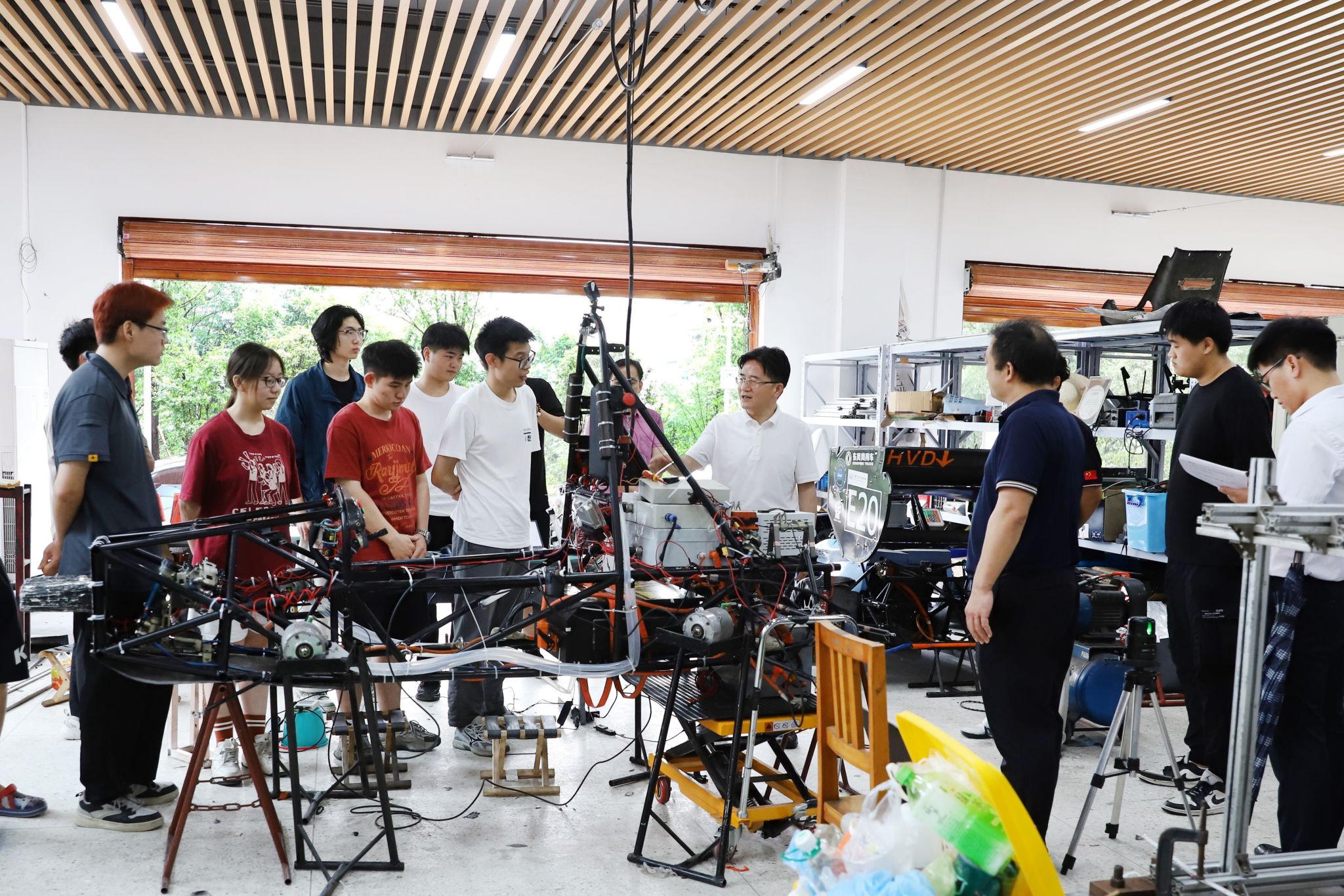 在东风HUAT车队和学生创新工作坊,张文学看望了正在准备各类创新比赛的团队。他表示,学校在全国的各类赛事活动中屡获佳绩,体现了学校的办学水平和人才培养质量,希望同学们在指导老师的带领下做好传承与创新,潜心钻研、攻坚克难,再接再厉再创佳绩。