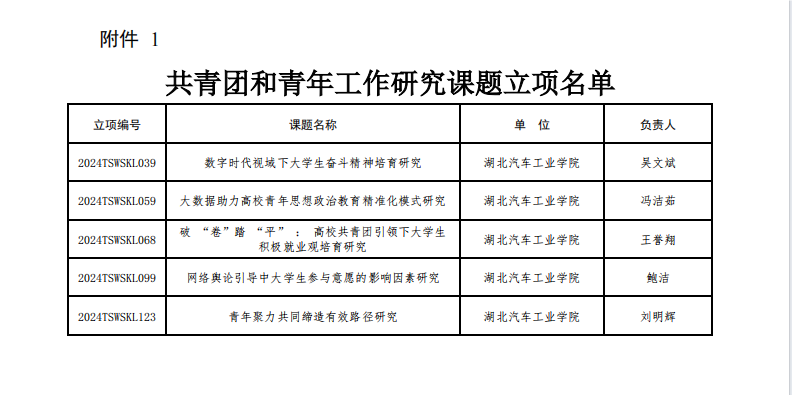 据悉,本次课题共确定2024年度湖北共青团和青少年工作研究课题立项169项,课题紧密围绕深入学习贯彻习近平新时代中国特色社会主义思想,全面贯彻落实党的二十大和二十届二中全会精神,深入贯彻习近平总书记关于青年工作的重要思想、习近平总书记关于少年儿童和少先队工作的重要论述,认真落实省委十二届五次全会和团十九大、团的十九届二中全会工作部署,扎实推进新时代共青团和少先队工作研究,突出问题导向,分析内在机理,提出对策建议,对于全省共青团和青少年工作有较强的参考价值。