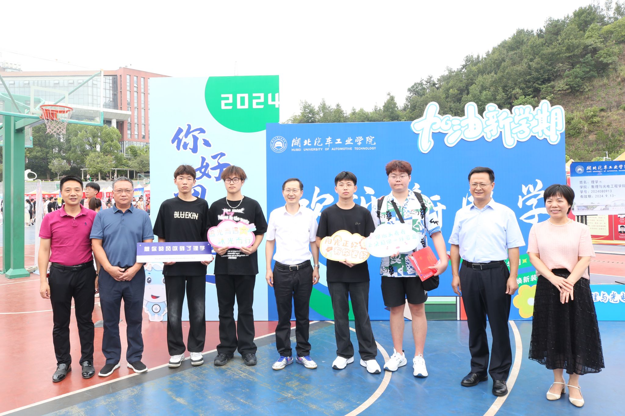 “你从哪来?”“什么时候到的十堰?”“有什么困难及时跟老师沟通”……在各迎新点,校领导一行热情地与新生及家长们亲切互动并合影留念。