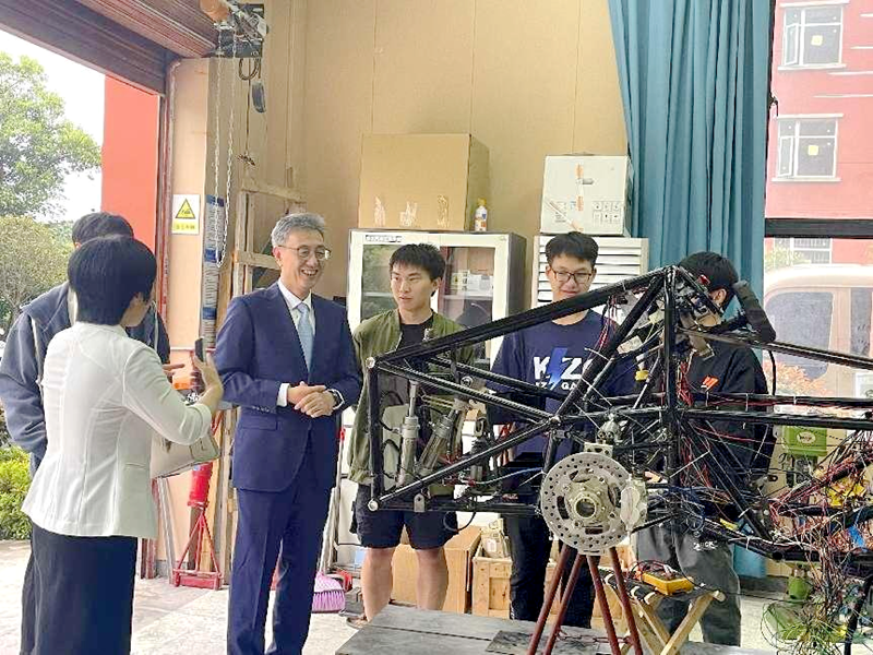 闫建来先后参观了学校大学生方程式赛车工作坊、科创展示交流中心和校史馆,并与车队队员进行了亲切交流。闫建来表示,汽车行业对推动社会发展具有重要作用,大学生方程式系列赛事开展有利于促进技术创新交流,培养汽车科技人才。