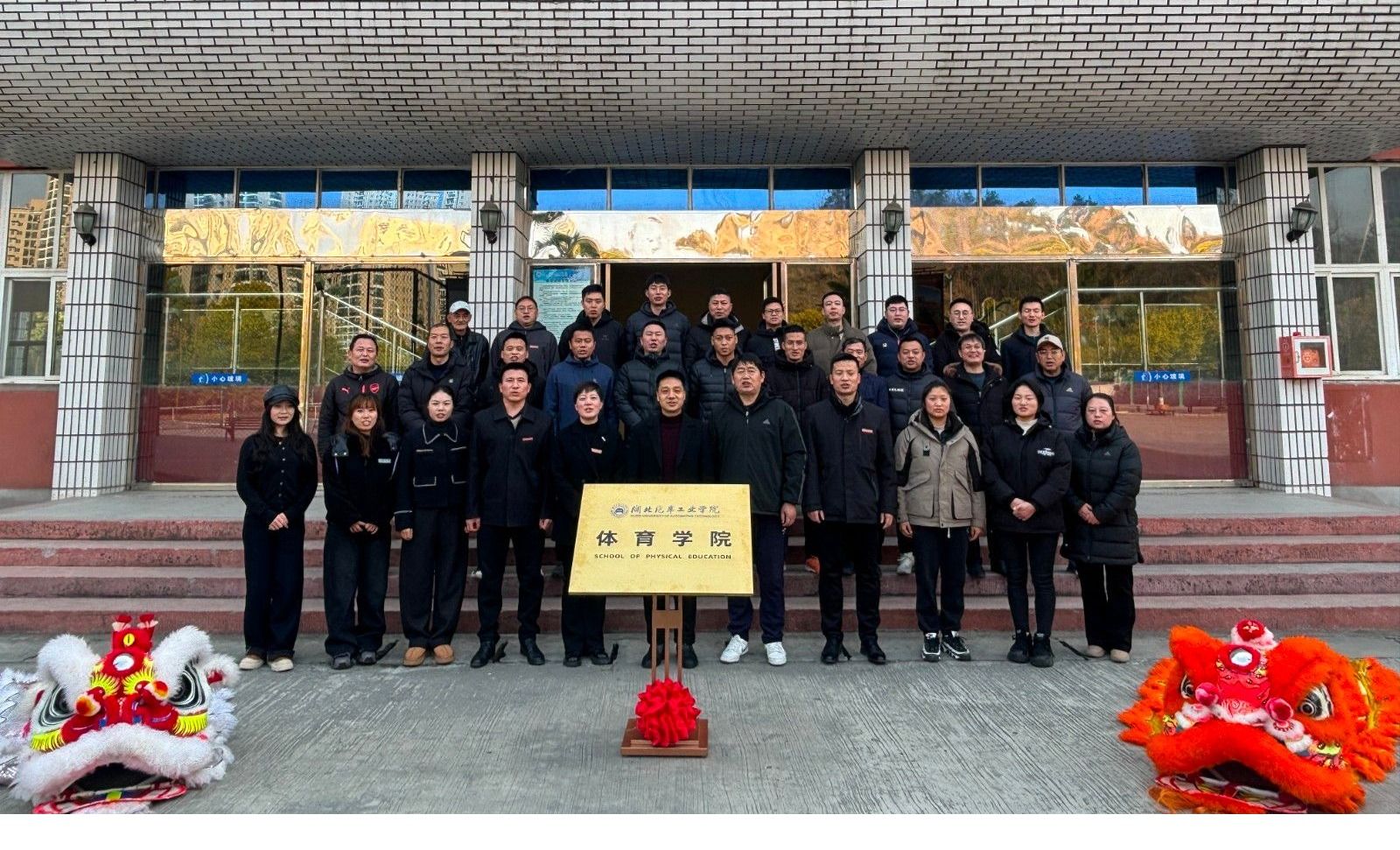 本网讯(文/黄小斌)1月18日下午,体育学院揭牌仪式在体育馆门前举行。学校党委常委、党政办主任王文山,学院全体教职工参加仪式。揭牌仪式由体育学院党委书记、院长熊玲主持。
