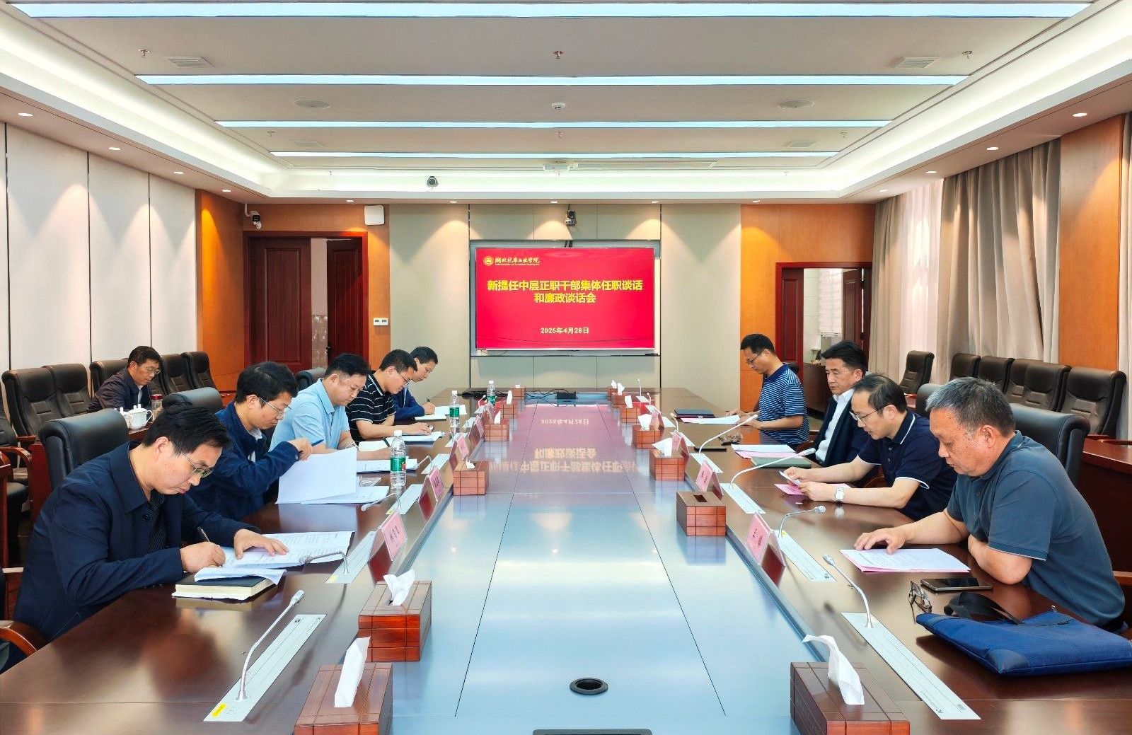 本网讯(文/图 肖越)4月28日,学校在产教大楼三楼多功能会议室召开新提任中层正职干部集体任职谈话和廉政谈话会。校党委书记张文学作集体任职谈话,校党委副书记、纪委书记、监察专员陈建平作廉政谈话,党委常委、组织部长王镇宣读任命决定。会议由党委副书记李涛主持。