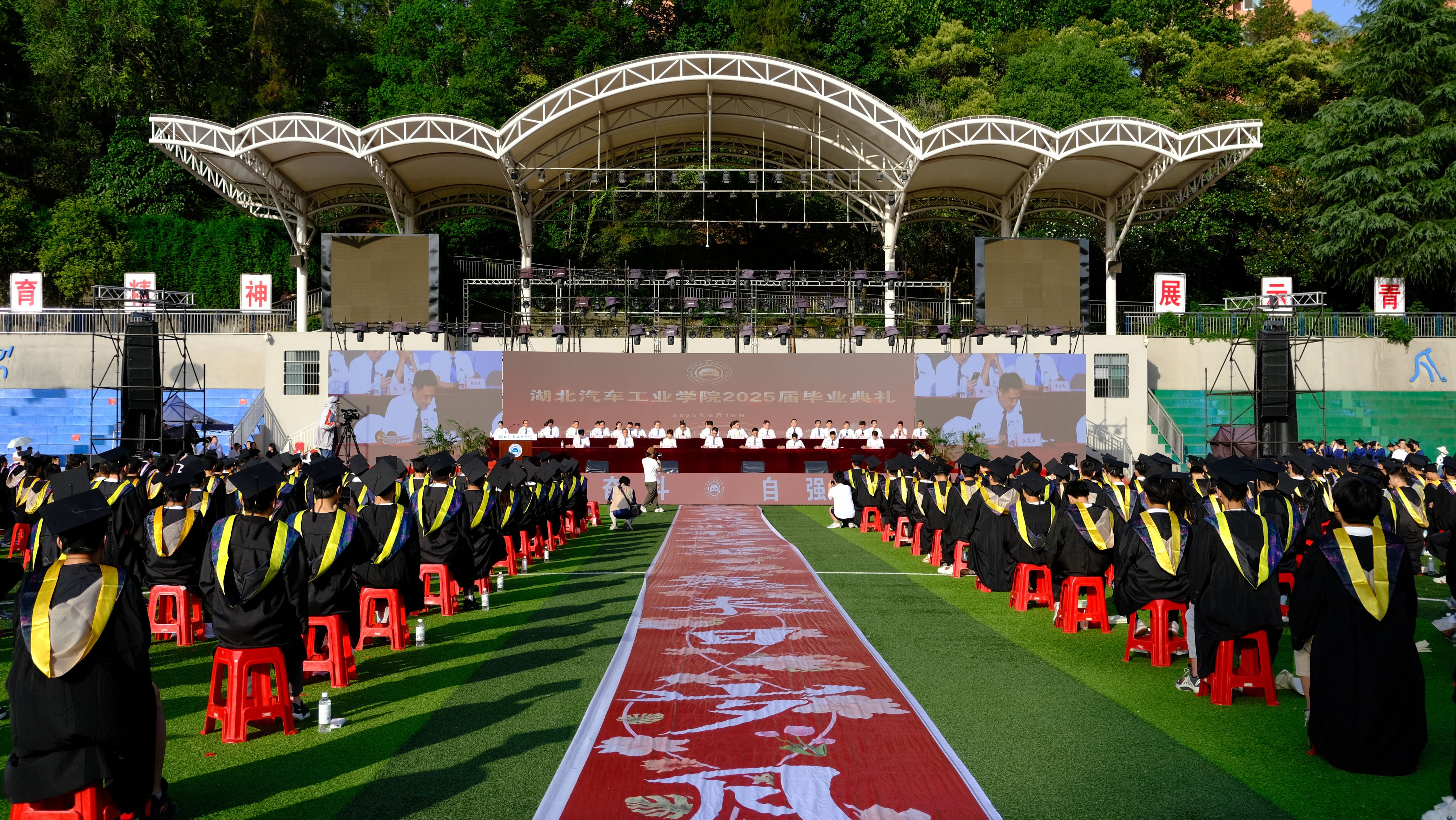 典礼现场右侧由设计学院提供的国家艺术基金作品展“文旅融合的武当民俗艺术数字化文创产品设计”,为全体师生带来充满创意与匠心的视觉盛宴。左侧“我们毕业啦”毕业生打卡心愿墙,吸引了大量毕业生驻足合影留念。东风纳米系列新款车型惊艳亮相,尽显科技创新魅力。