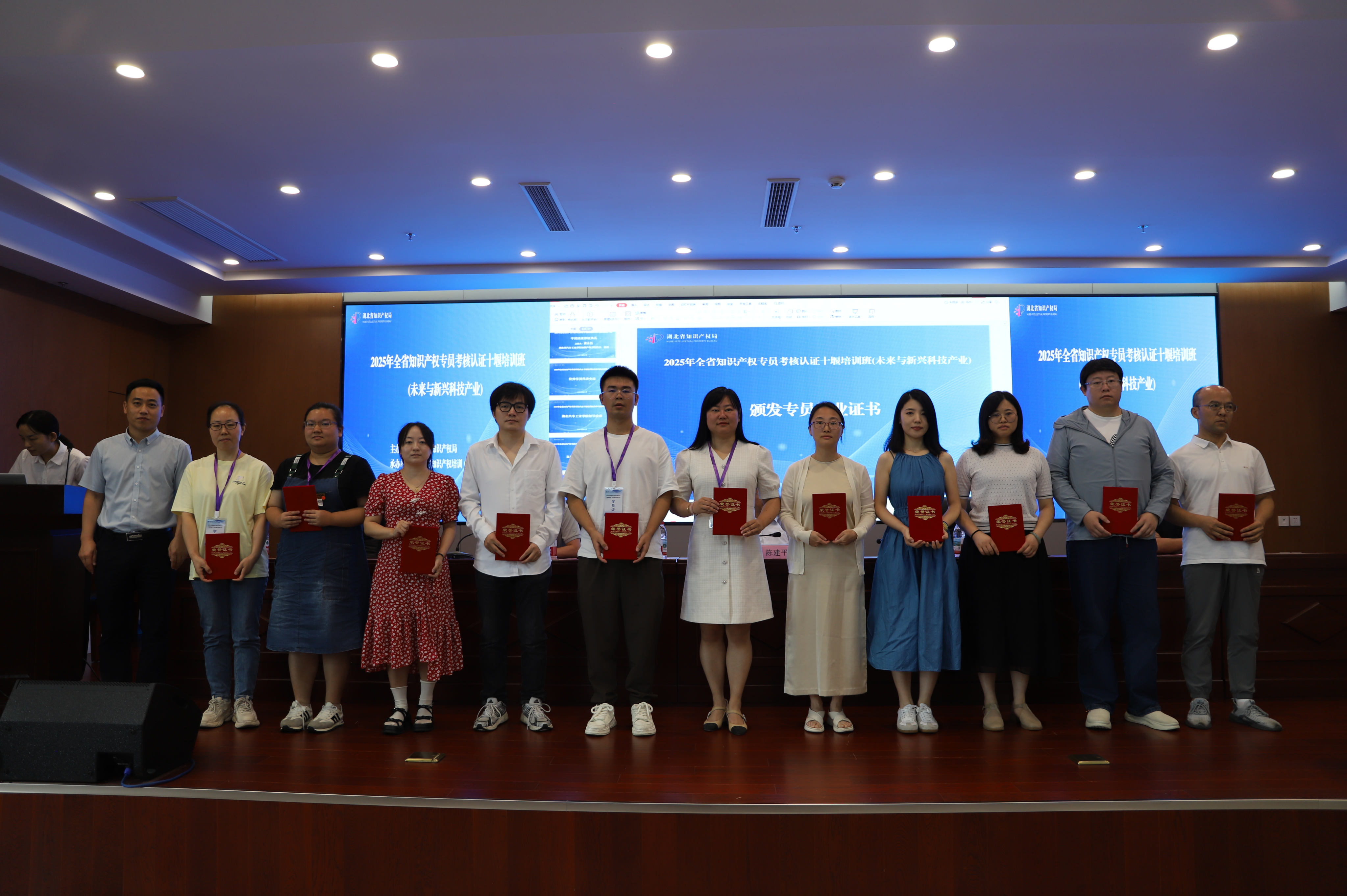 本网讯(文/肖玉杰)6月18日至20日,2025年全省“未来与新兴科技产业”知识产权专员考核认证培训班在校举行。来自武汉、十堰等7地的135家新兴科技链企业代表参训,124人通过理论与技能考核获“湖北省知识产权专员证书”。校党委副书记、纪委书记、监察专员陈建平,省知识产权局人事处副处长常承恩等出席结业活动。