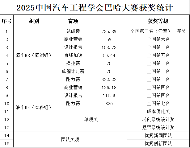 本网讯(文/孙国兴、邹春龙)近日,2025中国汽车工程学会巴哈(越野车)大赛在浙江湖州落幕。本次赛事吸引全国115支车队、近2000名学子同台竞技,英国上市公司365汽车智能制造学院飞翼车队携氢能巴哈赛车H3、燃油巴哈赛车U4参赛,最终斩获氢能组全国总成绩亚军(一等奖)、燃油组二等奖的优异成绩。