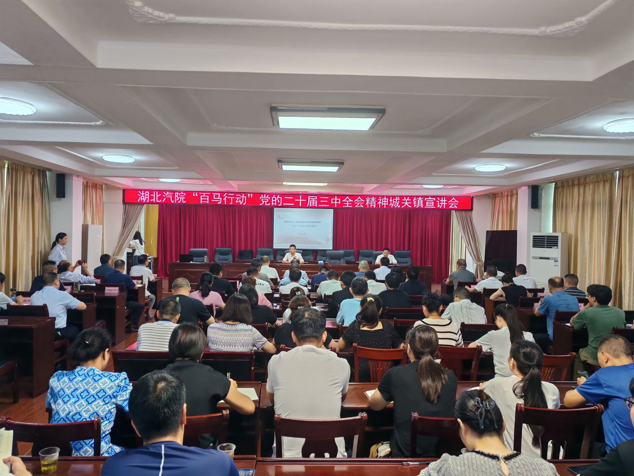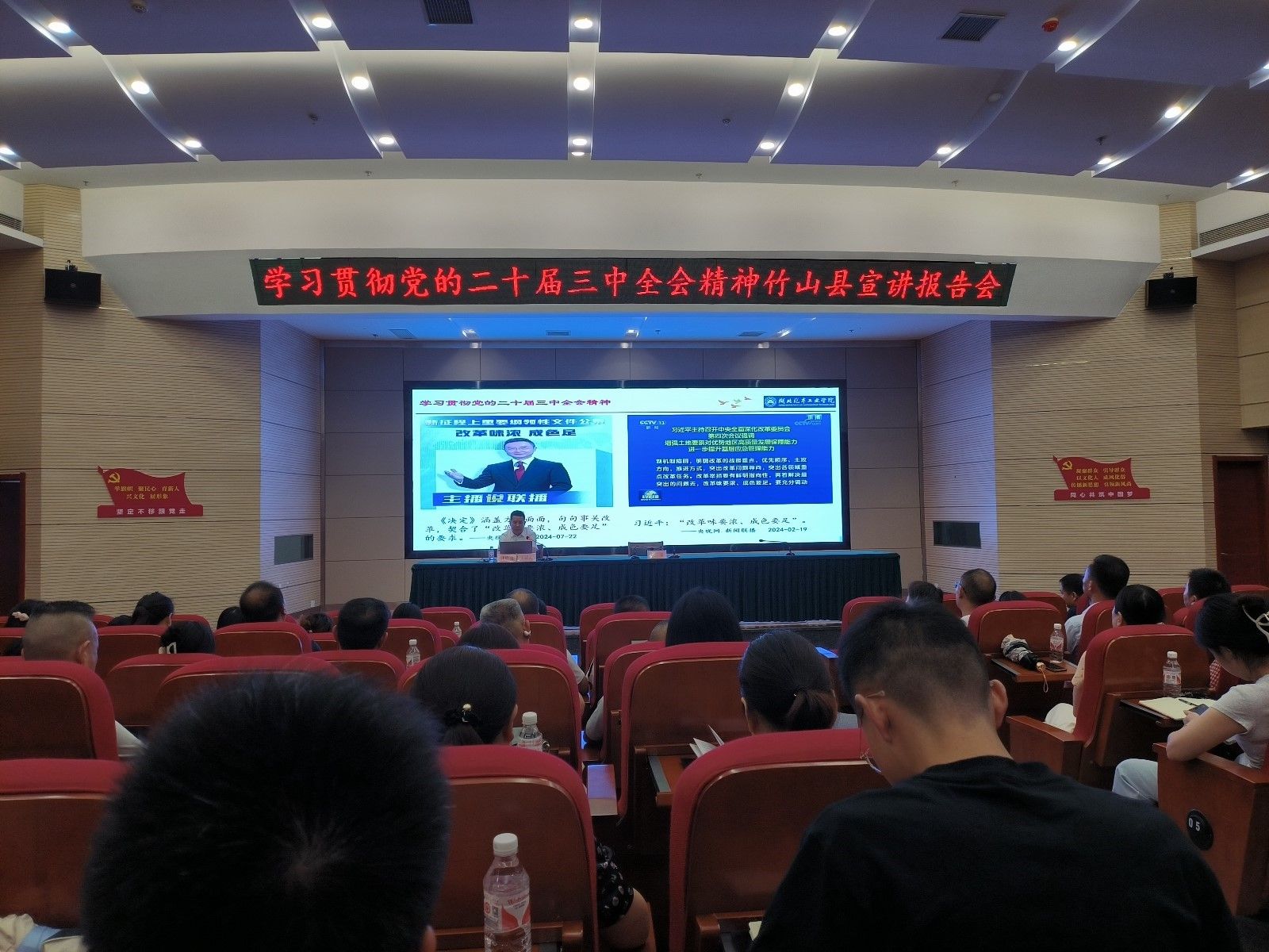 在竹山县新时代文明实践中心会场,马克思主义学院分党委书记计毅波教授以《以进一步全面深化改革开辟中国式现代化广阔前景》为主题,从全会的基本情况和主要成果、深刻认识党的二十届三中全会的重大意义和总体要求、准确把握重要改革部署和举措、提升党的领导水平和认真学习贯彻落实全会精神五个方面,对党的二十届三中全会精神进行了深入论述,县直单位100余名干部职工参会。