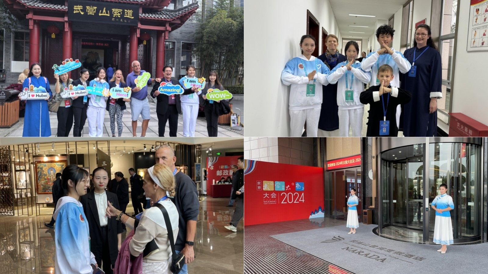 学校积极响应十堰市的办会需求,派出4位老师及52名学生志愿者全程参与大会保障服务。其中李诗、罗荔、汪梦楚三位老师作为“一对一”志愿者参与接待大会重要来宾;校团委高歌老师带领12名礼仪志愿者、40名翻译志愿者在武当山及会务酒店驻点进行服务。