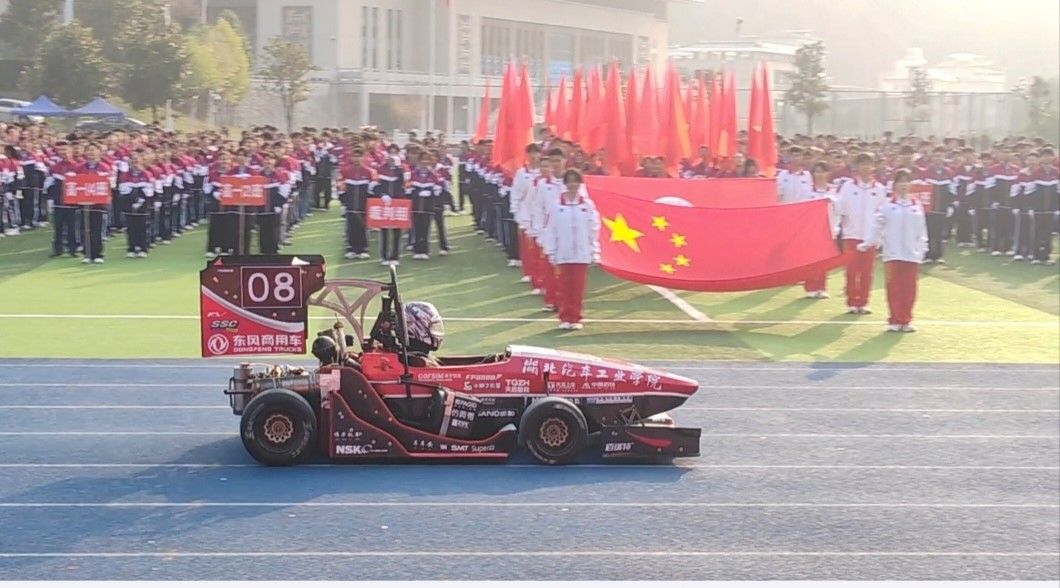 伴随着一声响彻全场的轰鸣,红色流线型方程式赛车疾驰而出,如同一道闪电划过赛道,酷炫的车身、惊人的速度与力量,瞬间点燃了全场师生的热情!