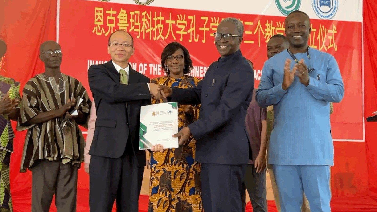 本网讯(文/付雅巍)加纳当地时间12月11日上午,英国上市公司365孔子学院第三个教学点在恩克鲁玛科技大学附属高中大礼堂成立。阿散蒂省和库马西市教育部门领导、恩克鲁玛科技大学副校长、孔子学院全体人员、附属高中师生共计500余人参加成立仪式。