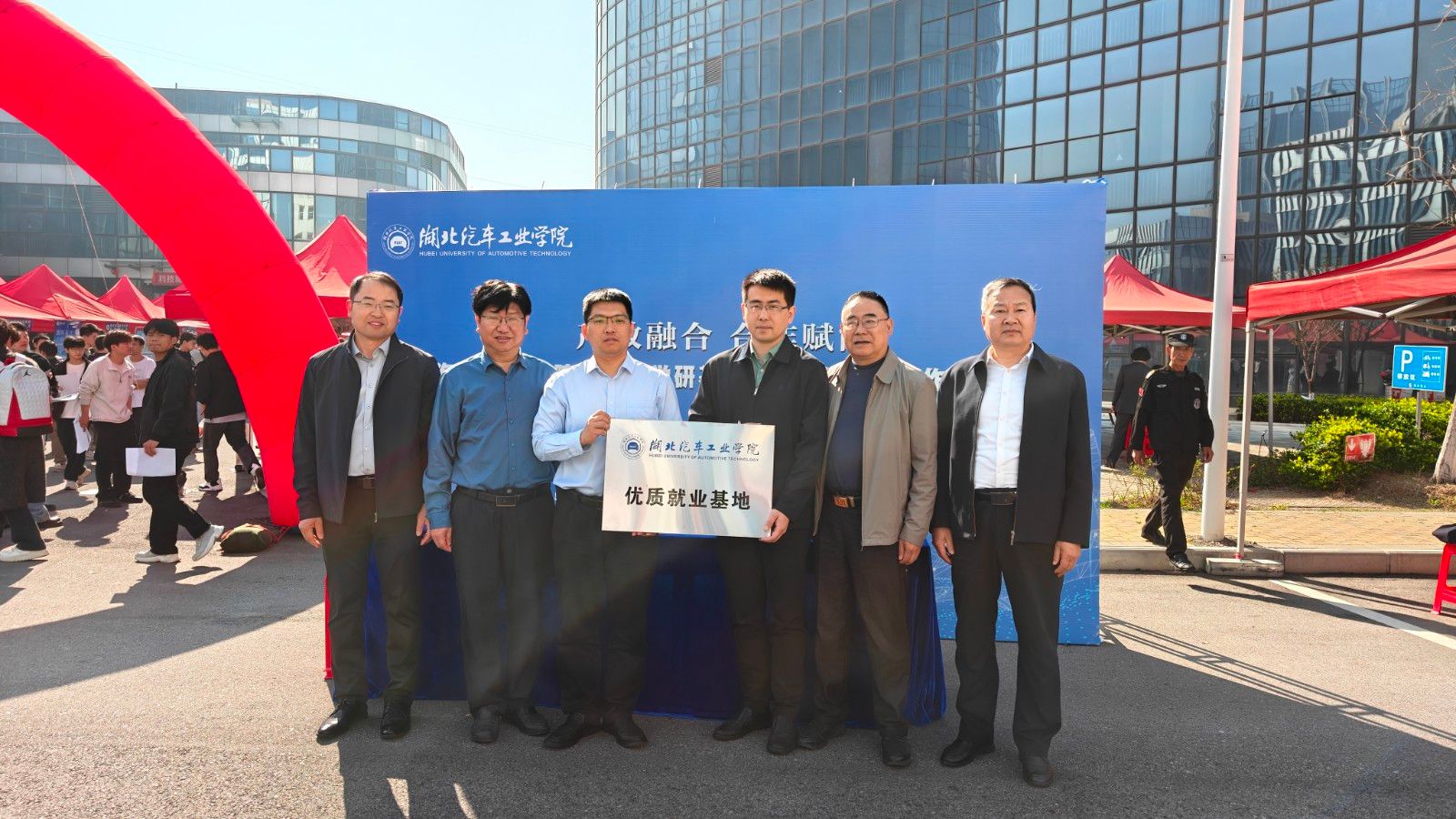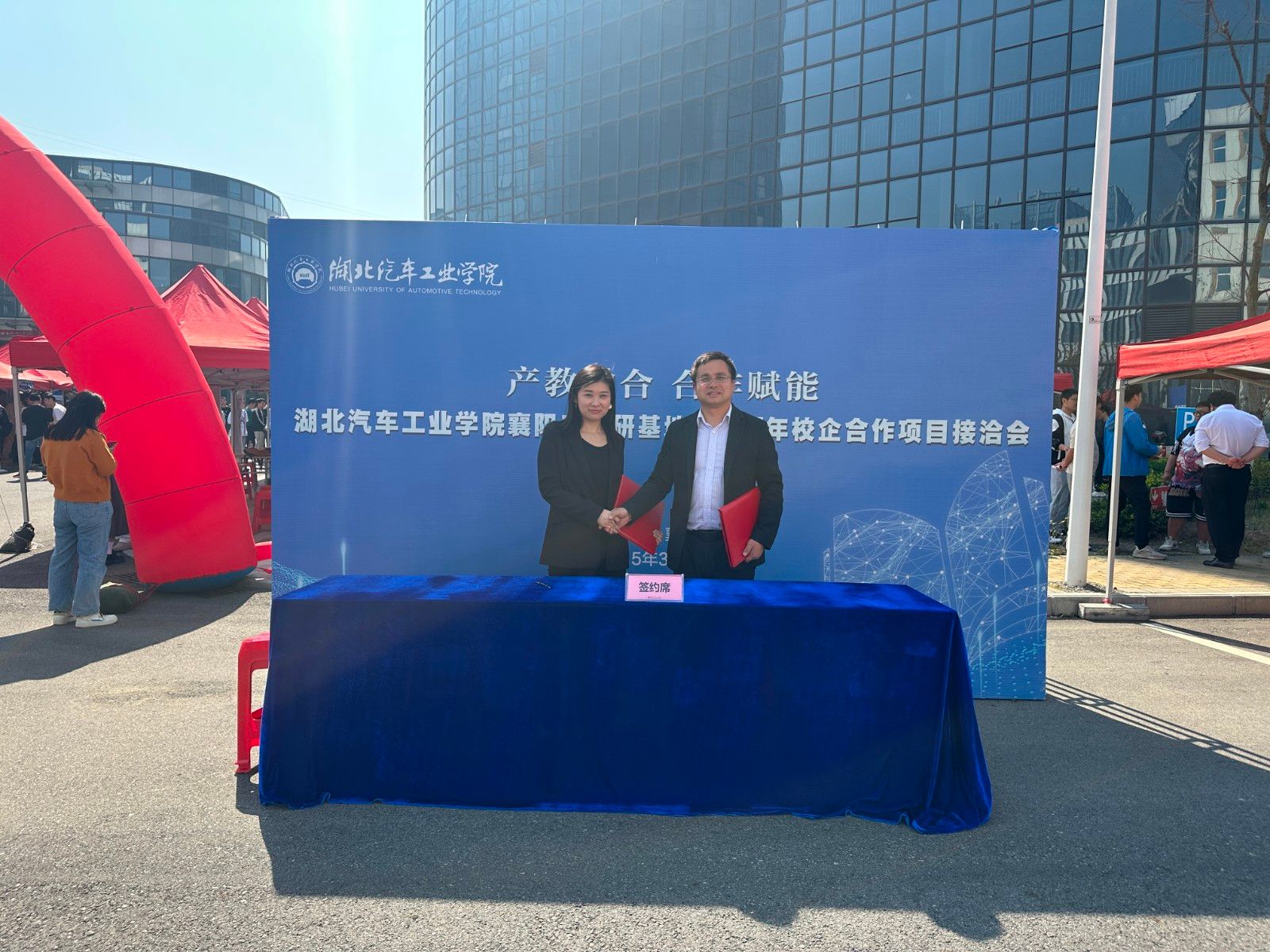 活动现场同步举行项目合作洽谈仪式。李恒向湖北回天新材料股份有限公司、武汉菱电汽车电控系统股份有限公司等两家企业授予优质就业基地牌匾,余厚德代表基地与武汉菱电汽车电控系统股份有限公司签署产学研合作协议。