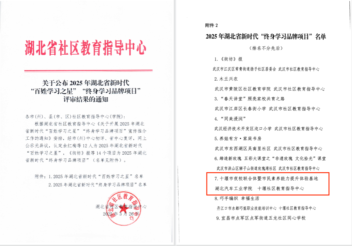此次获评既是荣誉,更是责任。未来,我们将以“服务全民终身学习”为使命,持续创新教育模式,让夜校成为市民提升素养的“加油站”、企业发展的“能量站”、社区治理的“助推器”,为湖北省学习型社会建设贡献十堰智慧,点亮全民终身学习之光。(审稿 缪勇)
