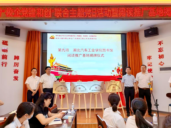 活动现场,校图书馆党支部书记陈战锋、馆长张慧,与十堰市广告协会党组织负责人李刚、愚公移山公司党支部书记朱伟共同为基地揭牌。
