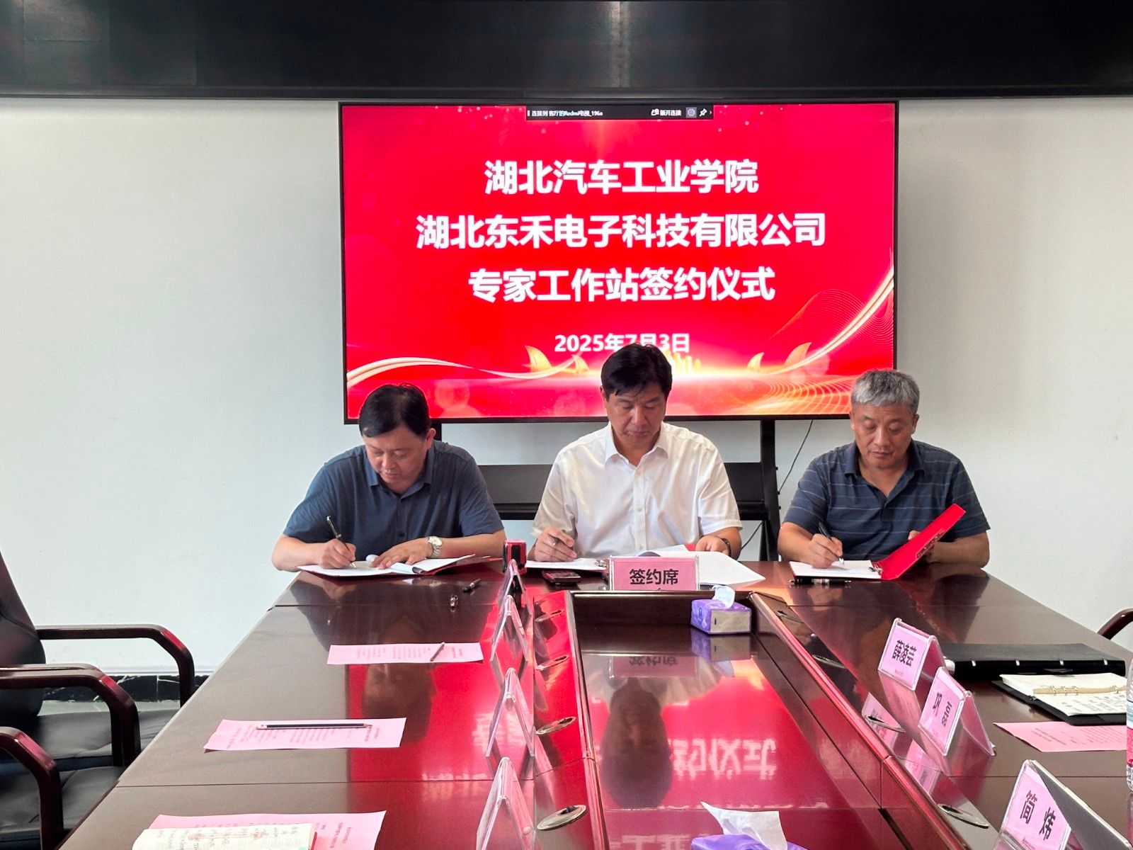 本网讯(文 薛凌芸/图 姚舒航)7月3日下午,学校与湖北东禾电子科技有限公司校企联合共建“专家工作站”签约仪式在襄阳产学研基地604会议室举行。学校学术委员会主任简炜教授,襄阳产学研基地党委书记、主任赵新军,湖北东禾电子科技有限公司总经理王桥彬等参加了签约仪式。