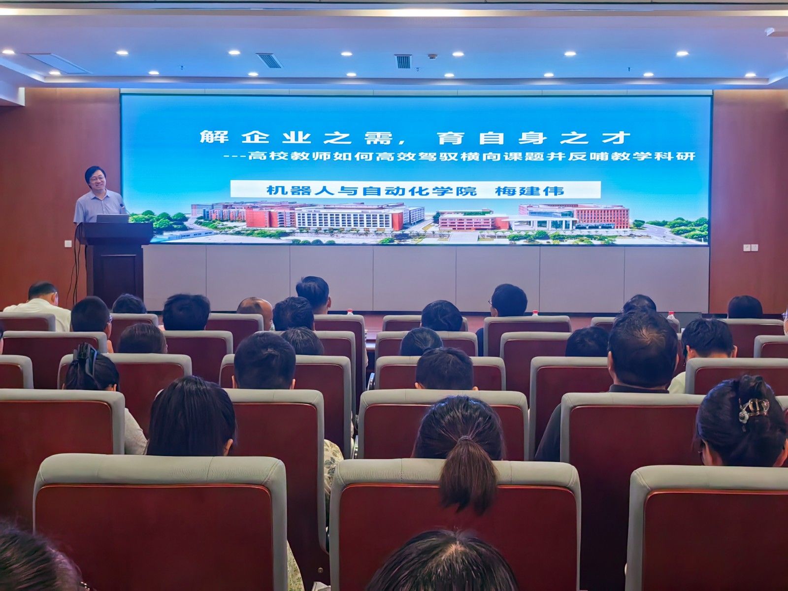 会上,三位嘉宾围绕科研工作作专题分享。王保华教授以“做有组织的科研——地方高校科研之路探讨”为主题,剖析地方高校科研挑战与发展路径;梅建伟教授结合实践,分享“解企业之需,育自身之才”的横向课题驾驭经验;李峰光教授聚焦国家自然科学基金申报,解读流程、现状并答疑解惑。