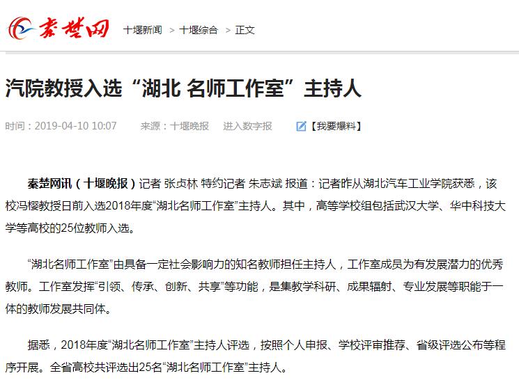 【秦楚网】汽院教授入选“湖北 名师工作室”主持人