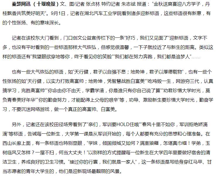 【秦楚网】汽院迎新横幅标语创意十足 网络潮语鼓励新生霸气又温情