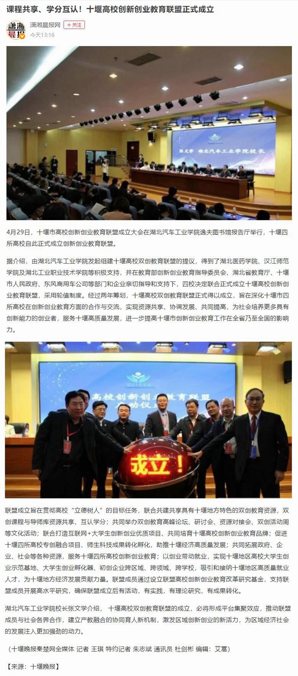 【潇湘晨报网】课程共享、学分互认!十堰高校创新创业教育联盟正式成立