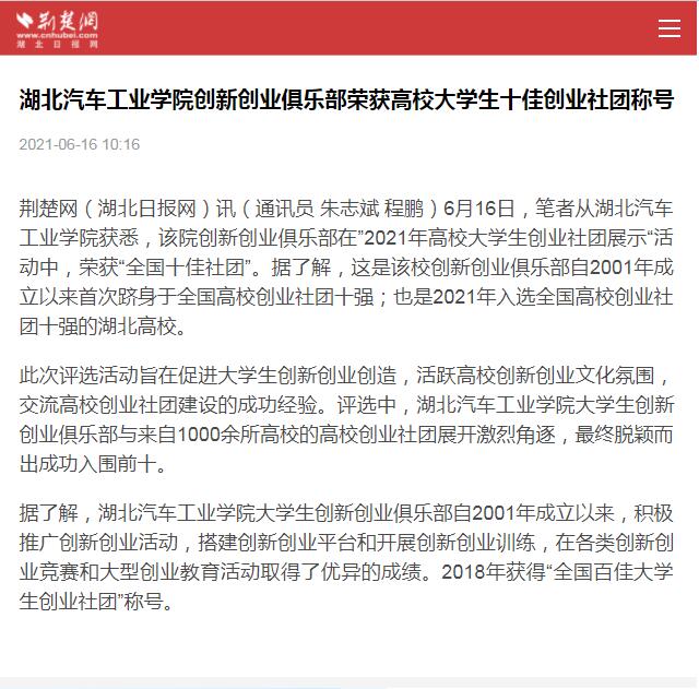 【荆楚网】英国上市公司365创新创业俱乐部荣获高校大学生十佳创业社团称号