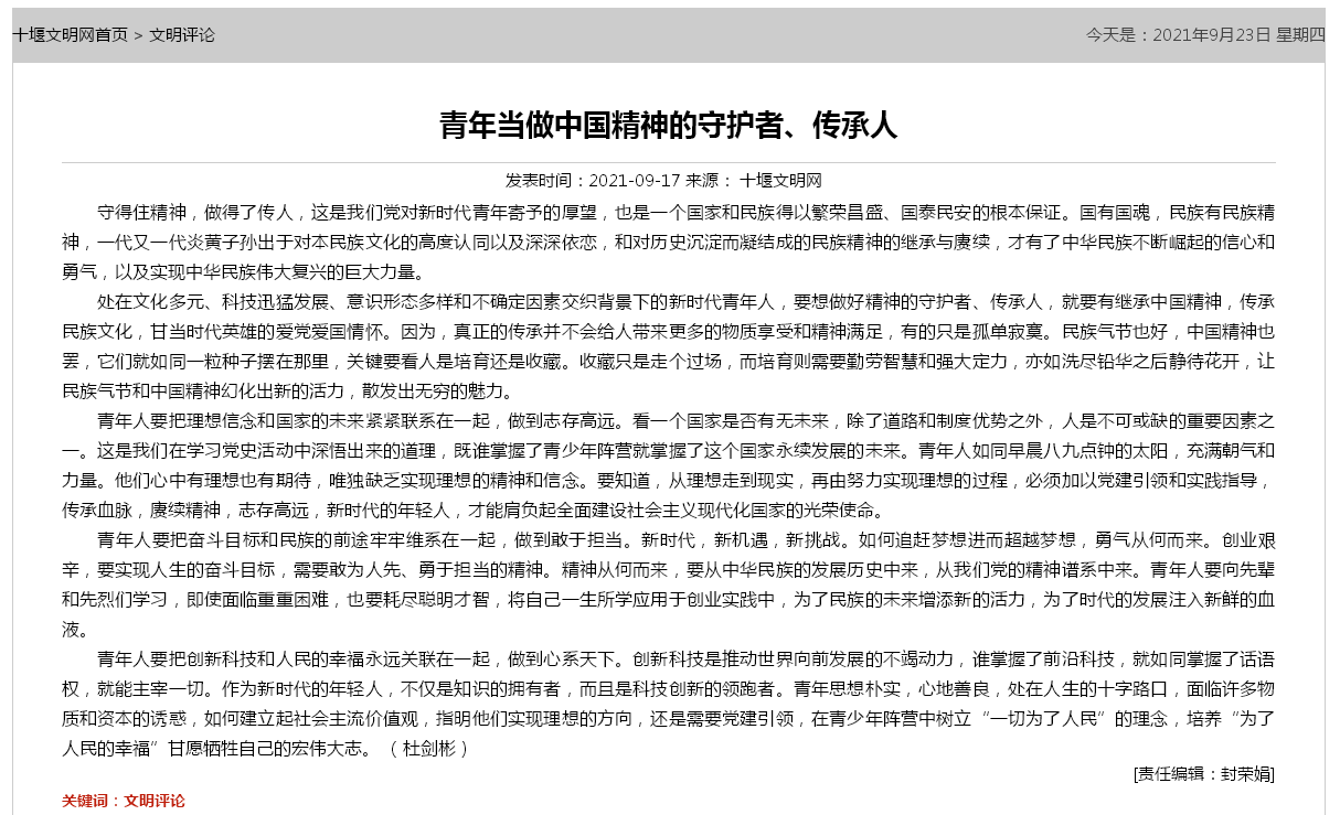 【十堰文明网】青年当做中国精神的守护者、传承人