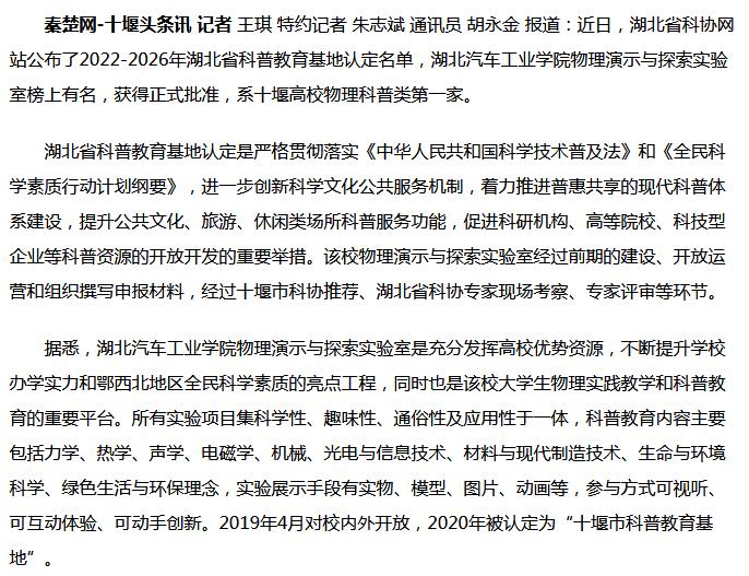 【秦楚网】十堰高校物理科普类第一家!汽院一实验室获批为省科普教育基地