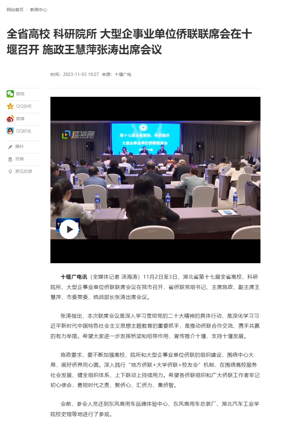 【十堰广电网】全省高校 科研院所 大型企事业单位侨联联席会在十堰召开 施政王慧萍张涛出席会议