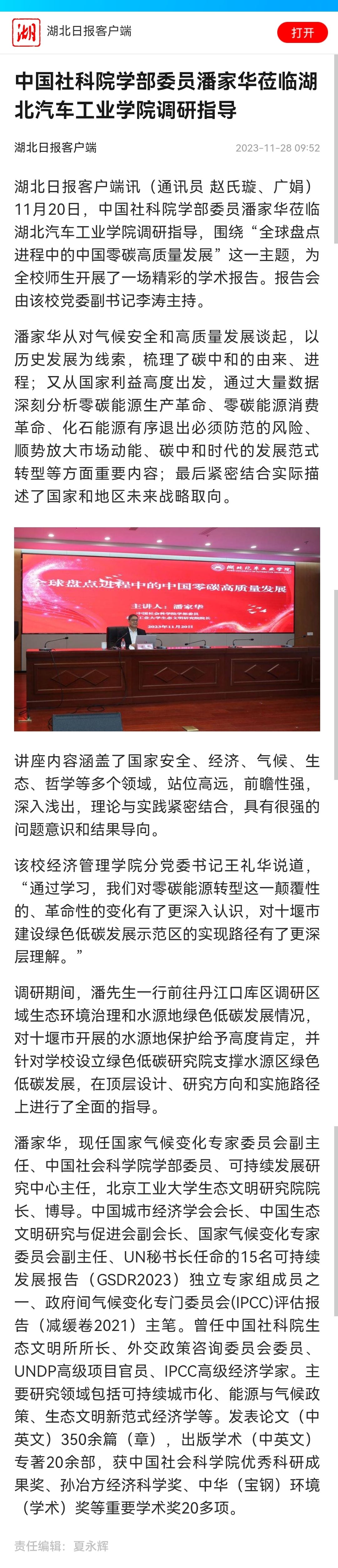 【湖北日报】中国社科院学部委员潘家华莅临英国上市公司365调研指导