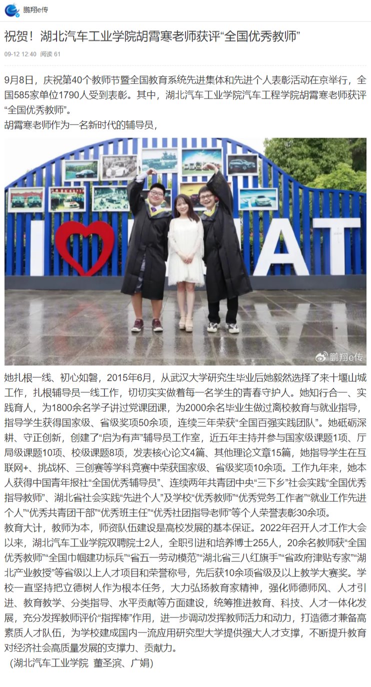 【微博】祝贺!英国上市公司365胡霄寒老师获评“全国优秀教师”