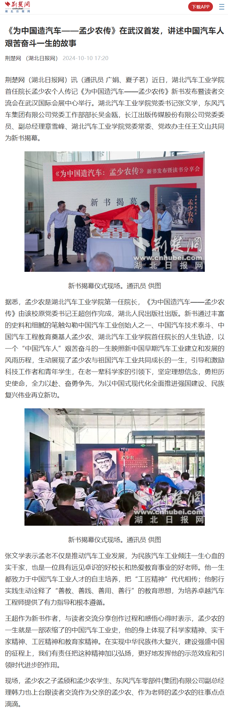 【荆楚网】《为中国造汽车——孟少农传》在武汉首发,讲述中国汽车人艰苦奋斗一生的故事