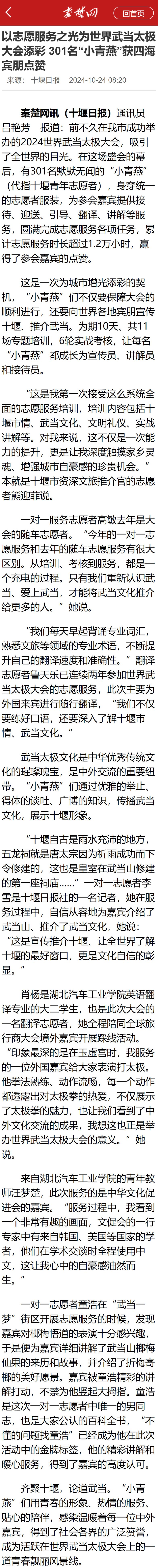 【秦楚网】以志愿服务之光为世界武当太极大会添彩 301名“小青燕”获四海宾朋点赞