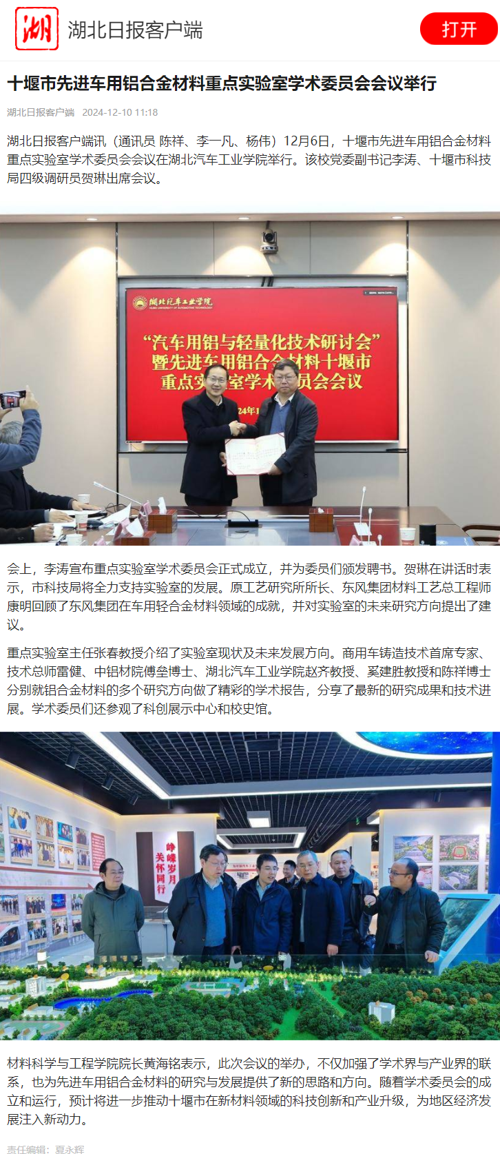 【湖北日报】十堰市先进车用铝合金材料重点实验室学术委员会会议举行