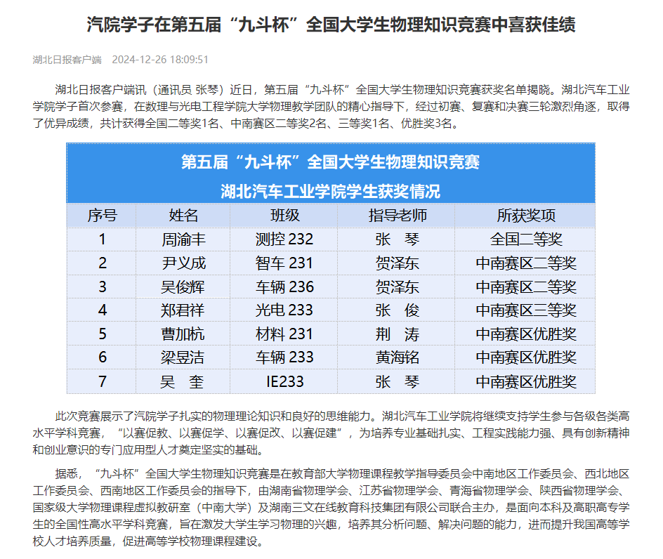 【湖北日报】汽院学子在第五届“九斗杯”全国大学生物理知识竞赛中喜获佳绩