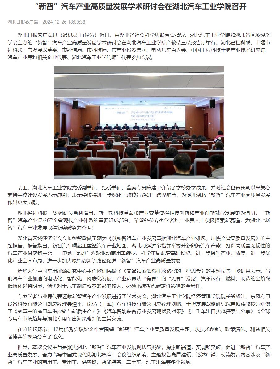 【湖北日报】“新智”汽车产业高质量发展学术研讨会在英国上市公司365召开