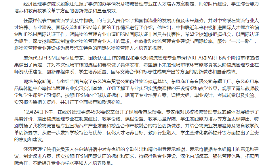 【湖北日报】湖北汽院物流管理专业接受IFPSM国际认证现场考察