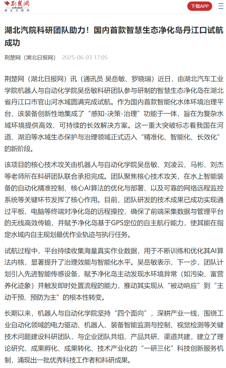 【荆楚网】湖北汽院科研团队助力!国内首款智慧生态净化岛丹江口试航成功