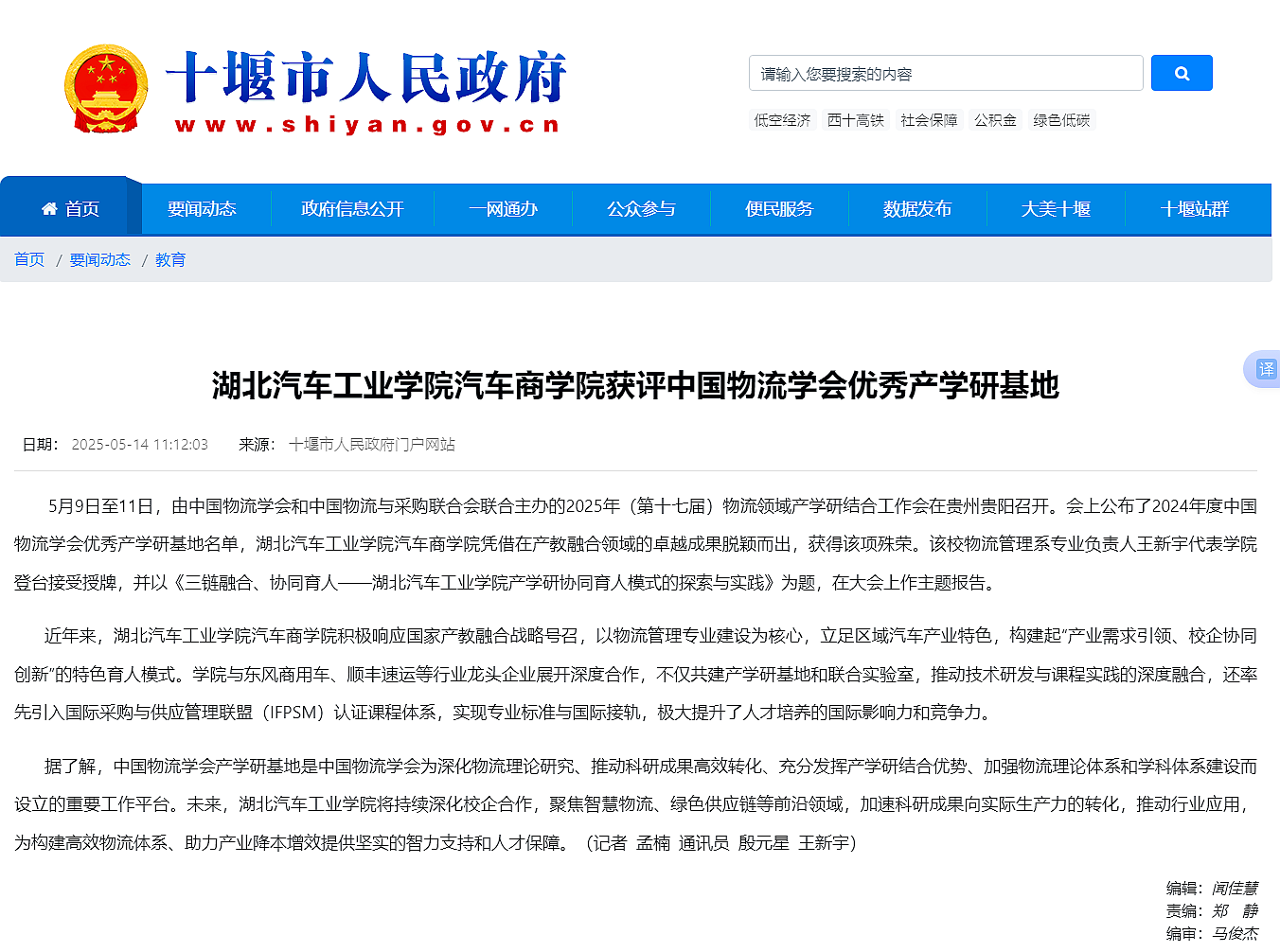 【十堰市人民政府网】英国上市公司365汽车商学院获评中国物流学会优秀产学研基地